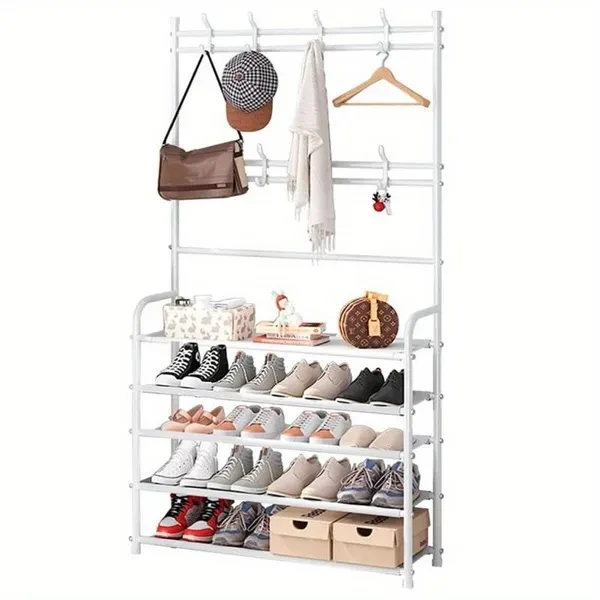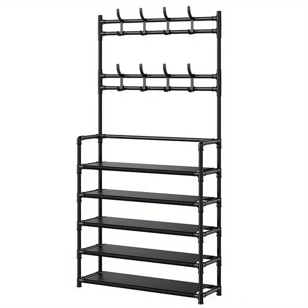 About the product ★ High-quality clothes rack: high-quality iron is the main material of clothes rack. Its surface is coated with an environmentally friendly coating to prevent the hanger from rusting. The bottom of the hanger is a small shoe rack that can be used to put shoes or shoe boxes, which not only gives you more storage space, but also makes the hanger more stable. ★ Save space: Open locker is the perfect combination of shoe rack, coat rack and hat rack, saving space. A total of 5 shelves, there is enough storage space to meet a variety of local needs and accessories, so that your life in order. ★ Simple structure: The coat rack with shoe rack is easy to disassemble and assemble, and it is a simple part that can be assembled in a few minutes. Thanks to the hall tree's simple structure and detailed instructions, the assembly is done before you know it. ★ Multi-functional hat rack: The hat rack is equipped with 8 hat hooks and 5 layers of shoe rack, the hat rack helps you keep the entrance clean, make your clothes and items orderly, easy to use, meet the needs of your clothes, large capacity, space saving, simple and convenient, convenient daily hanging. ★ Wide range of application: the hanger is suitable for placing behind the porch and door. Easy to store shoes, clothes, hats, bags, towels, umbrellas, etc. Perfect for your family bedroom, guest room, children's room, living room, and also perfect for your office. Hangers keep your clothes and accessories neat and have greater strength and stability.