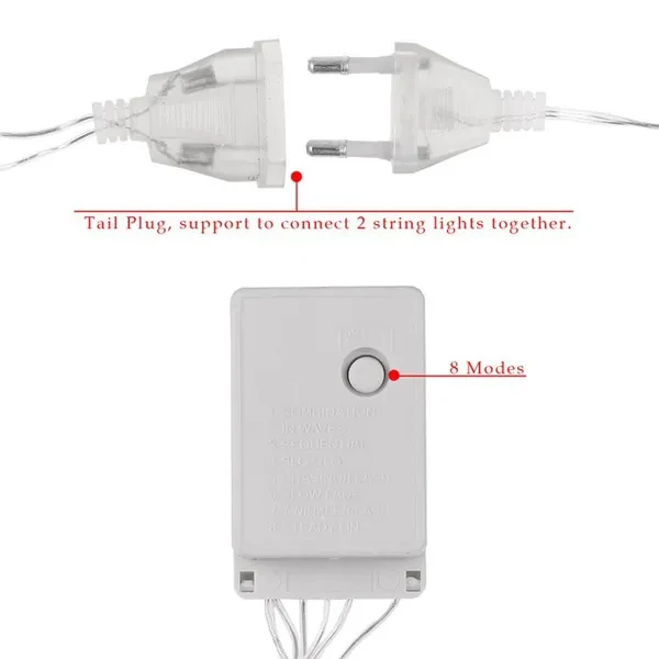 EU Pulg=220v US Pulg=110v Specification: LED color: Blue/White/Warm White/multicolor Input voltage: 110V/220V Plug standard: US/EU String Light length: 10m-100leds/20M-200leds Weight:10m:135g/pc package :1pcs 10m/20m string light 8 Modes Controller: 1.Combination;2.In Waves;3.Sequential;4.Slow-glow;5.Chasing/Flash;6.Slow Fade;7.Twinkle/Flash;8.Steady On. Features: Mini and artistic appearance, it is easy to carry. With multicolour light, it looks very beautiful in the night. Low power consumption, safe and reliable. One-button-operation design, it is more convenient to use. Oceans of little stars twinkle, flash and change magically. It can be put or hung on walls, windows, doors, floors, ceilings, grasses, christmas trees etc. A perfect decoration for Valentine's Day, Christmas, other holidays, party, wedding, etc. With 8 different play modes: Combination, In Waves, Sequential Chasing/Flash, Slow/Fade, Twinkle/Flash, Steady On. EU Pulg=220v US Pulg=110v Specification: LED color: Blue/White/Warm White/RGB Input voltage: 110V/220V Plug standard: US/EU String Light length: 10m-100leds/20M-200leds Weight:10m:135g/pc package :1pcs 10m/20m string light 8 Modes Controller: 1.Combination;2.In Waves;3.Sequential;4.Slow-glow;5.Chasing/Flash;6.Slow Fade;7.Twinkle/Flash;8.Steady On. Features: Mini and artistic appearance, it is easy to carry. With multicolour light, it looks very beautiful in the night. Low power consumption, safe and reliable. One-button-operation design, it is more convenient to use. Oceans of little stars twinkle, flash and change magically. It can be put or hung on walls, windows, doors, floors, ceilings, grasses, christmas trees etc. A perfect decoration for Valentine's Day, Christmas, other holidays, party, wedding, etc. With 8 different play modes: Combination, In Waves, Sequential Chasing/Flash, Slow/Fade, Twinkle/Flash, Steady On.