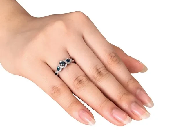 1/2 Carat (ctw) Blue & White Diamond Three-Stone Infinity Ring 14k White Gold This glamorous ring features three shining blue diamonds to represent your past, present and future together. The 14 karat white gold band is adorned with round brilliant diamonds for even more sparkle, bringing the total gem weight to over 0.50 carats (ctw). Beautifully & professionally crafted with the finest materials Can be cleaned with standard jewelry cleaning solutions, warm soapy water or polishing cloths - do not use abrasives as it will leave scratches This item ships directly from the USA. If you are not completely satisfied, simply return for a 100% refund This item ships in signature jewelry box packaging, ready for gift-giving with a classic, elegant look and feel This item is the perfect gift for any birthday, anniversary, graduation, stocking stuffer, holidays, thank you, thinking of you, Christmas, Mother's Day, Valentine's Day or for any reason at all SKU: 08DLG4409050-P
