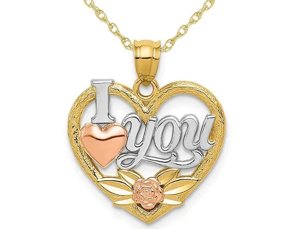 14K Yellow, White and Rose Gold - I Love You - Pendant Necklace Charm with Chain