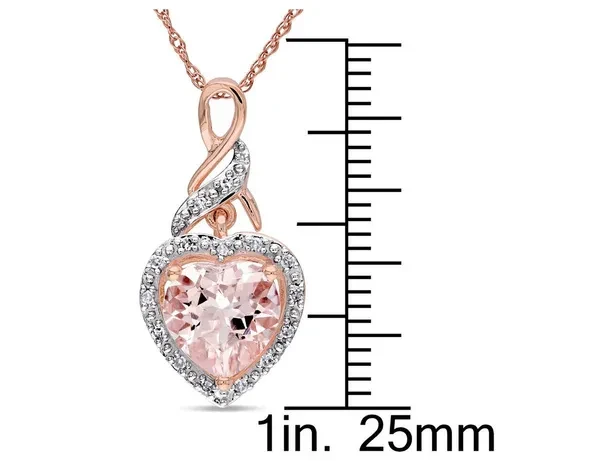 1.80 Carat (ctw) Morganite & Diamond Heart Pendant Necklace in 10K Rose Pink Gold with Chain A shimmering jewel heart shines from the center of this beautiful gemstone necklace. Set in glistening 10-karat rose pink gold, this infinity heart drop pendant features 1.80 carats (ctw) of glowing pink Morganite and twinkling white diamonds. Matching earrings are available. Beautifully crafted in 10k rose gold with a Polished Finish and includes the matching chain Stone Type: Morganite; Color: Pink; 1.75 CTW; Quantity: 1; Heart Cut; Heart Shape; Natural; Prong Setting Stone Type: Diamond; Color: G-H; Clarity: I1-I2; .06 CTW; Quantity: 15; Brilliant Cut; Round Shape; Natural; Prong Setting This item ships in signature jewelry box packaging, ready for gift-giving with a classic, elegant look and feel This Diamond Heart Pendant Necklace is the perfect gift for any birthday, anniversary, holidays, thank you, thinking of you, or for any reason at all SKU: 02DLG43100MO