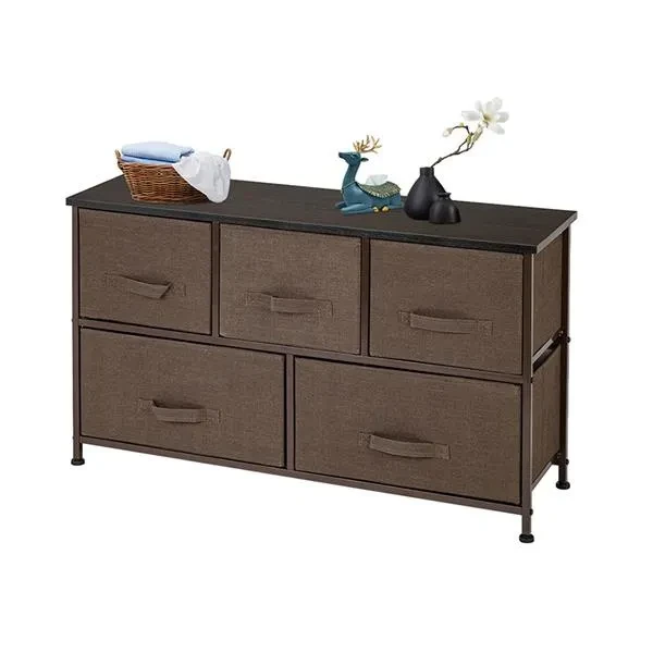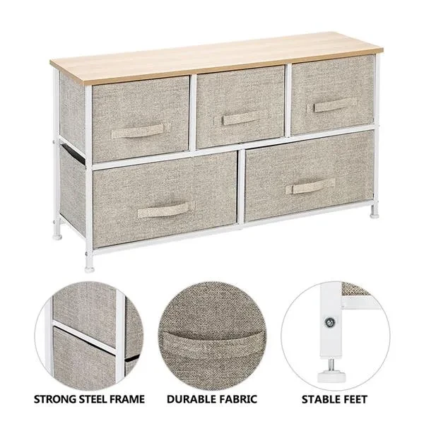 Introductions: Give your household essentials a cozy landing spot with the 5-Drawer Dresser. This beautiful dresser chest features a tabletop surface and pull-out drawers to tuck away household clutter. The thoughtful design is great for small living spaces and works equally well near the bed or sofa. Organization enthusiasts will enjoy filling each drawer with clothing, linens, and knick-knicks from around the home. The lightweight frame makes this unit easy to transport and when not in use, simply fold the fabric drawers flat for storage. Use alone as a single unit or pair with any drawer configuration from the Furniture Collection. Features: 1.Restore A Tidy Home: Bits and pieces scattered everywhere in your home? With these 5 removable drawers you can sort items by type; easily tame the mess and bring back the fresh feeling to your sweet home 2.When Fabric Meets Rigid Metal: A perfect mix bringing its strengths into full play - iron frame offers stable support for fabric boxes, and the fabric element adds a soft and warm touch to the metal-framed dresser drawer, and is more lightweight to move 3.Every Room Scrambles For It: The cloakroom wants it as a cabinet to offer a home for workout gear, leggings and pajamas; the nursery wants a chest of drawers to stow baby stuff; the entryway wants a space saving storage unit for coming and going things; what's your plan 4.Stability Comes First: Crafted with a wooden tabletop and metal frame, the dresser is stable and durable. 4 adjustable feet allow you to use it on uneven surfaces and adds extra stability 5.Easy to assemble: With a simple structure, it's a breeze to assemble the storage unit. Simply fix the screws in position and unfold the 5 drawers and it's ready to tame the mess Note: 1.When receiving the goods, please confirm the product according to the listing of instructions. Once you find Less pieces, please provide relevant pictures to contact us. We will deal it in the time. 2.Please install goods with the instruction manual. 3.It is recommended that the installation should not be too tight to adjust easily. After the structure is installed, firm the interface for more stability. Specifications: 1.Color: Linen / Natural£¬brown£¬gray 2.Material: MDF(Medium Density Fiberboard),Iron,Non-Woven Fabric 3.Frame Dimension: (39.4 x 11.4 x 21.7)" / (100 x 30 x 55)cm (L x W x H) 4.Drawer Dimension: (18.11x 10.63 x 8.46)"/ (46 x 27 x 21.5)cm (L x W x H) / (11.81 x 10.63 x 8.46)" / (30 x 27 x 21.5)cm (L x W x H) 5.Drawers: 5drawers 6.Product Care: Wipe Clean With A Wet Cloth And Let It Dry 7.Product Weight: 20.5lb / 9.3kg 8.Static Load Capacity Of The Shelf: 33lb / 15kg 9.Static Load Capacity Of Each Drawer: 11lb / 5kg Package Includes: 1 x Drawer Storage Dresser 1 x Assembling Tool Kit 1 x Instructions