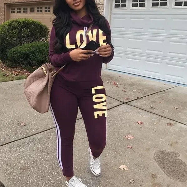 Pattern: Letters Style: pants suit Top style: coat Top sleeve length: long sleeve Pants style: straight pants Length: trousers Popular elements: printing Process: Printing/Dyeing Color: purple red, army green, blue, black, wine red, Size: S, M, L, XL, XXL, XXXL