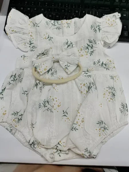 Baby Girls Romper, Sleeveless Floral Pattern Classical Round Neck Ruffle Waist Design Button Closure Jumpsuit with Bow Hair Band Perfect for your kids in daily wear and suitable to photograph, which is very cute. The casual babies wears are made from high quality material that is soft, gentle and comfortable. It´s a beautiful and comfortable outfit for little babies to wear. Size Charts Size(cm) 70 Length: 38 Bust: 52 80 Length: 41 Bust: 54 90 Length: 44 Bust: 56 100 Length: 47 Bust: 58 Size(inch) 70 Length: 14.96 Bust: 20.47 80 Length: 16.14 Bust: 21.26 90 Length: 17.32 Bust: 22.05 100 Length: 18.50 Bust: 22.83 Specifications Material: cotton. Size: 70, 80, 90, 100. Gender: female. Season: summer. Style: cute style. Notes Please understand there may be mild deviation exist. Due to the lighting and monitors, there are slight difference between the picture and the real item. Package Content 1 * romper and 1 hair band. Promise If the product has any quality problems, please feel free to contact us, we will help you solve the problem as quickly as possible.
