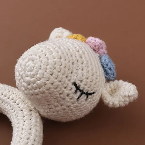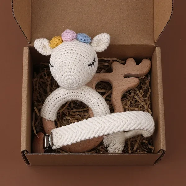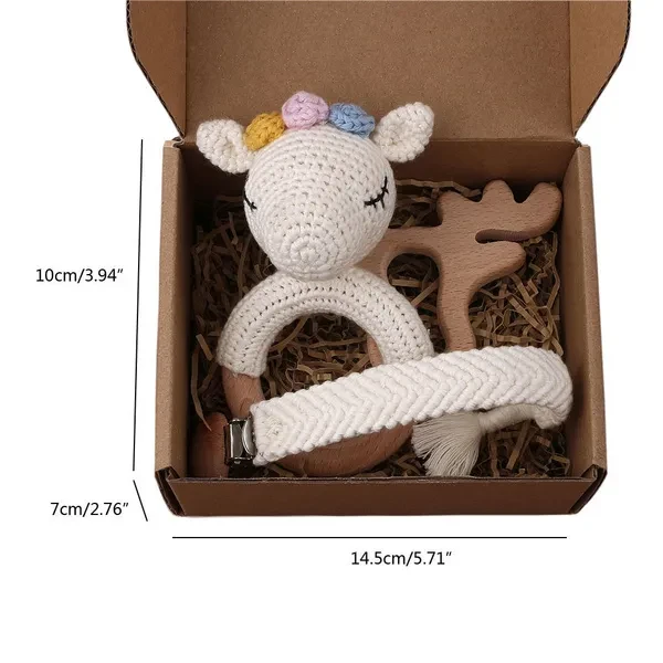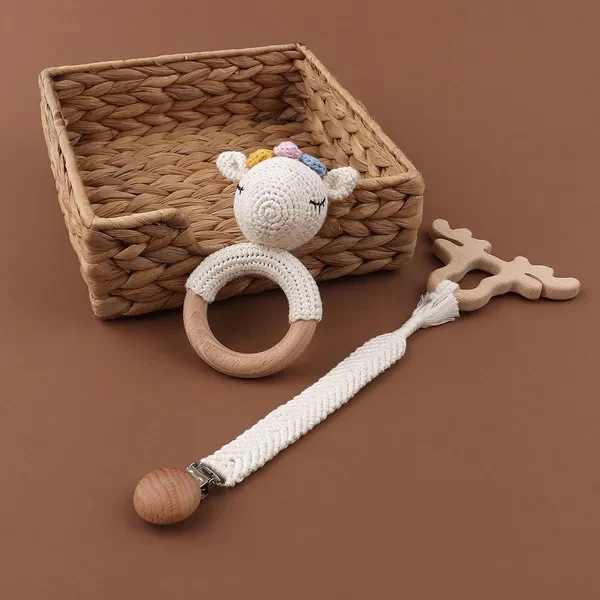3PCS Handmade Crochet Baby Rattle Toys Animal Beech Wooden Teething Ring Teether Pacifier Chain Clips Set Newborn Shower Gifts Baby Stuff BUT