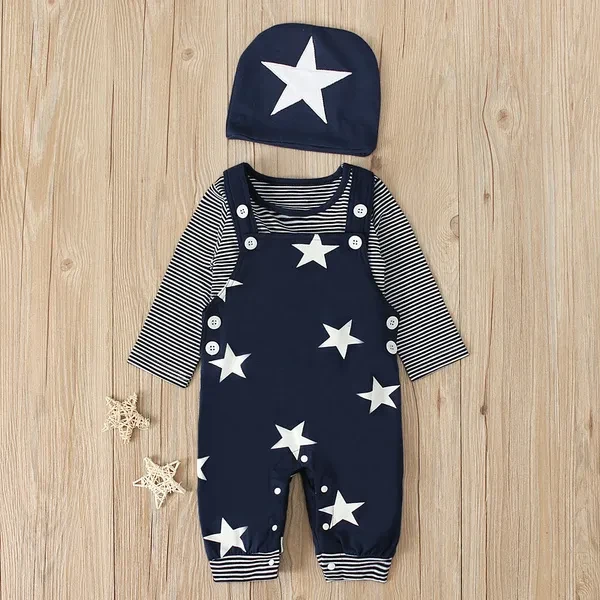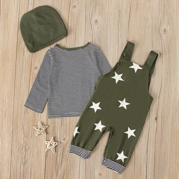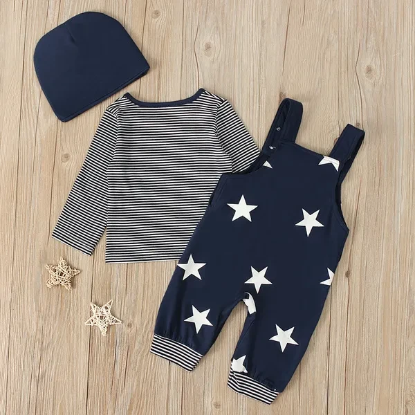 3PCS/Set Baby Toddler Boys Gentleman Suits:Long Sleeve Striped Tops + Bib Pants + Beanies Hat Outfits Clothes
