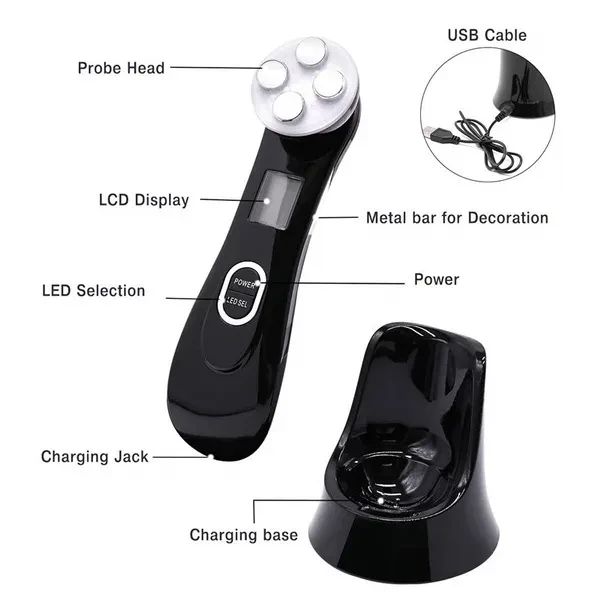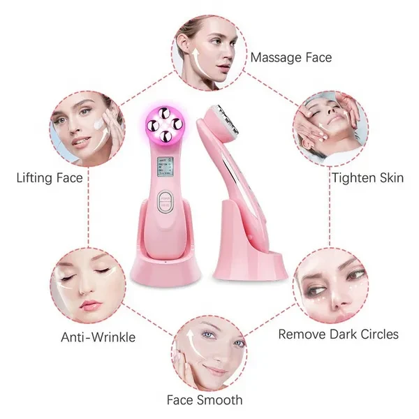 ??Face Massager Content: With box: 1*5 in 1 Face Massager(bulk pack ) 1*Base holder 1*USB cable 1*Use manual ??Face Massager Specification: Material: ABS Input: 100V-240V Output: DC5V500mA Battery capacity: 750mAh Power: Max 10W Charging time: 3.5 hours Use time: 10min/time Product size: 165*45*46mm Color:white,black,pink ??Face Massager Features: 1.It's interated with photon LED therapy,radio frequency(RF)/EMS and LCD display techology 2. It helps the skin to tighten, maintain elasticity, prevent allergies and other problems; 3. It can relieve muscle soreness, reduce skin fatigue, soothe skin tightness, reduce redness, swelling and pain of skin, and resist repeated growth of acne; 4. Stimulate the production of collagen, can help the skin quickly introduce a variety of skin care products, so that the skin doubles the absorption of nutrients. 5.It's a beauty care tool for beauty salon at home/office/trip ??Why buy our Face Massager ? 【5 in 1 Face Beauty Machine 】The LED light has 5 colors with 6 skin care functions that are suitable for various skin problems. Make your face more soft and get the tender skin. 【Solve Different Skin Problems】Focus on reducing wrinkles, skin lifting & tightening, anti-aging and promote the absorption of skin care products. No age and gender restrictions, no time and place restrictions 【Nutrition Lead-In】Use our skin care massager with your skin care product like mask, gel or cream, you will find the absorption effect is much better than the effect that use by hand. 【Portable & Exquisite】 Our portable face care massager is light , small and rechargeable. You can do your own skin care at home and do not need to spend money in beauty salon. 【USB Charging】Our face care massager can be used anytime, anywhere with an easy-to-use USB cable. Fast USB charging via PC,power bank or directly connecting to power source. ??Any inquiry to buy Face Massager ? If you have any dissatisfaction or doubt about our Face Massager , please contact us for the first time, and we will give you a satisfactory solution within 24 hours.