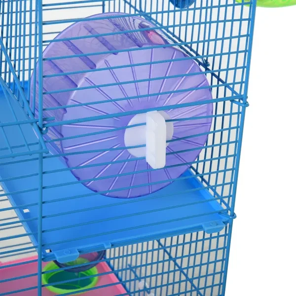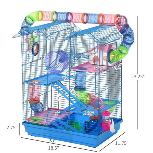 Descriptions Keep your small pets stimulated, safe and happy with a Multi-level indoor small animal cage kit. This animal-friendly design offers multiple platforms for exercise, fun, relaxation, and exploration for small pets like hamsters, mice, gerbils, etc. This hamster cage starter kit includes the main habitat, water bottle, food dishes, and exercise wheels. Play tubing system promotes activity and allows your small pet to move freely. Features - This cage offers multiple platforms for exercise, fun, relaxation, and exploration for your lovely pet. - Includes a small house on the perch, water bottle, food dishes, ladder and exercise wheels - Play tubing system promotes activity and allows your small pet to move freely - The front door allows you access to your hamster easily - Multiple levels design provides plenty of space for activities - The Internal accessories can be placed freely - Simple assembly required Specifications - Color: Blue - Material: Metal, PP, PS - Overall Dimensions: 18.5"L x 11.75"W x 23.25"H - Bottom Tray Size: 18.5"L x 11.75"W x 2.75"H - Door Size: 6" x 5"H - Perch Size (4 perches): 11"L x 6" - House Size: 6.25"L x 3.5"W x 3.5"H - House Door Size: 1.75"L x 2" - Ladder Size: 8.75"L x 2.25" - Exercise Wheels Size: Φ5" x 3.25" - Dishes Size:Φ3.25" x 1.5"H - Water Bottle 80ml - Tube Size: Φ2.25' - Net Weight: 9lbs.