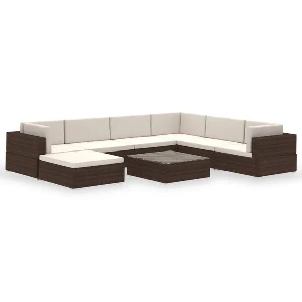 This poly rattan garden furniture set combines style and functionality and will be a real eye-catcher in your garden or on the terrace. This rattan sofa set can be used outdoors all year round. The lounge group is made of weatherproof and waterproof PE rattan; it is therefore hard-wearing enough to be used by the whole family every day in all seasons. It is also resistant to UV light, chlorine and salt water and has a sturdy, powder-coated steel frame and rustproof plastic feet. Thanks to the lightweight construction, the set is also easy to move. The 6 cm thick, removable seat and back cushions are very comfortable. The easy-care polyester covers with hidden zippers can also be removed and washed. The rattan seating group can be flexibly repositioned and adapted to any environment. Delivery contains 3 x corner elements, 3 x middle elements, 1 x stool, 1 x coffee table with glass top, 7 x seat cushions, 9 x back cushions. Note: We recommend covering the set in rain, snow and frost.
