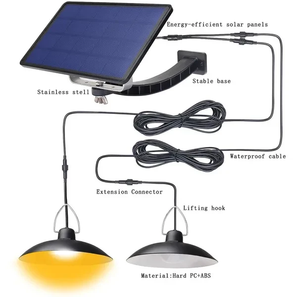 ►NOTES: 1.When using for the first time, you need to turn on the button behind the panel to charge successfully 2.Please let it under sunshine to charge it for several hours when you use it at first time 3.The efficiency of the solar panel depends on the weather,the strong sunshine it has,the better efficiency it will be,the efficiency of the panel will be weakened on cloudy day,the longer sunshine it has,the working time will be longer The specifications Product Name: LED Solar Pendant Light Brand: TRLIFE LED type: upgrade SMD LED Quantity: Each head with 20 LEDs Solar Panel: 5V 15w for 4 headlights Led light color: warm white / white shade Material: PC shell Material: PC + ABS Operating mode: automatically turn on at night until the power is off Installation steps: 1. Connect the solar panel connector line first, 2. Install the solar panel and set the outdoor sun exposure position 3. Hang the lamp cover housing and set the lighting position 4. Distribute the 3 meter extension cable Specification: 4 options: single head, two heads, three heads, four heads LED beads: 20 pieces, 40 pieces, 60 pieces, 80 pieces LED light color: warm white, white Color Temperature (warm light): 3000K - 4500K Color Temperature (white light): 6000K Waterproof: IP65 Lampshade Material: PC Shell material: PC + ABS Package listing:(Optional) 1 x Solar Panel 1/2/3/4 x Heads 1 x Extra 3 meters Cable 1 set of screw accessories