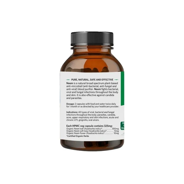 Product description Neem supplement online and create protection shield for your body from infection, bacteria and several other problems. Organic India, neem capsule is best blood purifier supplement.