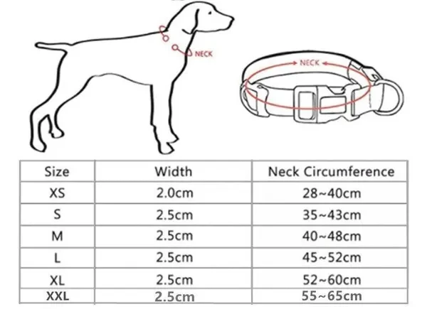 Size XS =Width 2.0CM Length 28-38cm S = Width 2.5CM Length 34-41cm M = Width 2.5CM Length 37-46cm L = Width 2.5CM Length 41-52cm XL = Width 2.5CM Length 42-56cm Note: If the collar is too long, you can cut it short by yourself. Features: Product Name: LED dog collars Material:Polyester webbing , fish screen translucent surface , bright guiding light flat fiber ( new material ) Color:Red, blue, yellow , green, orange , , pink. Flashing mode:Long light . Flash Slow flash ( via switch control ) Charging model: charge for half an hour and use it for about 2-3 hours. There is a USB charging cable Package included: 1x pet collar in OPP bag 1x USB Charging cable This merchant is committed to only offering products that comply with the General Product Safety Regulation.
