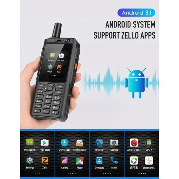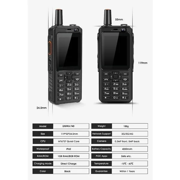 4G version. Long antenna version/Short antenna version Alps F25 2.4-inch touch screen, 4G Android smartphone Android intercom with ZELLO, PTT network intercom 1) 4G signal is enhanced through an external antenna 2) Mtk6735 quad core 3) Zello Walkie Talkie 4) Front and rear dual cameras 5) GPS navigation 6) 3500mah large battery with ultra long standby time 7) Global 4G 8) Double card and double standby Intelligent intercom terminal device with 2.4-inch touch screen and 4G buttons, Android smartphone with ZELLO PTT network and software intercom function, support for downloading apps, black screen intercom, memory 1+8GB quadcore processor core, front and rear dual cameras supporting law enforcement recording, adding memory card to expand memory, supporting the use of third-party APP software or network intercom applications such as Taotao and Weila, and unlimited intercom distance, universal, let it go Network format: GSM, CDMA, 3G (WCDMA), 4G (TD LTE) Processor core: quad core Color: Black European version, Black American version Model: ALPS F25 Running memory: 1GB Appearance: straight plate Main screen size: Small screen (below 4.0 inches) CPU brand: MediaTek Brand: UNIWA Article number: F25 3C Certificate No.: 2021161606612142 Body memory: 1G+8GB standard version Battery capacity: 3000mAh -3999mAh Network mode: dual card dual mode Memory card: supports memory cards Mobile version: Hong Kong, Macao and Taiwan version Telecommunication equipment network access license number: 02-B432-214122 Operating system: ANDROID Camera pixels: 8-11.99 million Main sales regions: Africa, Europe, South America, Southeast Asia, North America, Northeast Asia, Middle East Phone type: Professional Android intercom phone 4G; Model No. Alps F40 Waterproof Level IP65 Dimensions 119*55*24.5mm Net Weight 188g (Including battery) Service Provide Unlocked Style Bar Shell Material Plastic Band 2G: GSM850/900/1800/1900MHz; 3G: WCDMA B1/B2/B5/B8, TD-SCDMA B34/B39 4G: FDD-LTE:B1/B3/B4/B7/B8/B20; TDD-LTE:B38/B39/B40/B41 SIM card Dual SIM card dual standby OS Android 6.0 Marshmallow CPU MTK6737M Cortex A53 quad core, 1.1GHz; GPU: Mali-T720 RAM 1GB RAM ROM 8GB ROM, support TF up to 32GB maximally Screen 2.4 inch QVGA IPS capacitive touch screen, 320*240px Phonebook 1000 Message SMS/MMS Input Handwrite/Keypad Speaker φ32 loudspeaker Earphone Port 3.5mm  Data transfer USB/Bluetooth Mobile internet WAP/WiFi Camera Double cameras, 0.3MP front camera, 5.0MP back camera FM Radio Yes, earphone needed WiFi Yes, IEEE802.11b/g/n GPS Yes, also support A-GPS BT Yes, V4.0 (BR/EDR+BLE) POC Button Yes, Zello walkie talkie apps can be pre-installed Gravity Sensor N/A Standby time Up to 240 hours Other Features Email, wallpapers, tethering & portable hotspot, play store, etc Languages English, Bahasa Indonesia, Bahasa Melayu, Cestina, Dansk, Deutsch, Eesti, Espanol, Filipino, French, Hrvatski, Isizulu, Kiswahili, Italiano, Latviesu, Lietuviu, Magyar, Nederlands, Norsk, Polish, Portuguese, Romana, Rumantsch, Slovencina, Slovenscina, Suomi, Svenska, Vietnamese, Turkish, Greek, Bulgarian, Russian, Ukrainian, Urdu, Hebrew, Arabic, Persian, Thai, Khmer, Hindi, Japanese, Korean, Simplified/Traditional Chinese Color Black Accessories 1 x 4000mAh Li-Polymer battery 1 x USB cable 1 x USB power adaptor 1 x Belt chip 1 x User manual