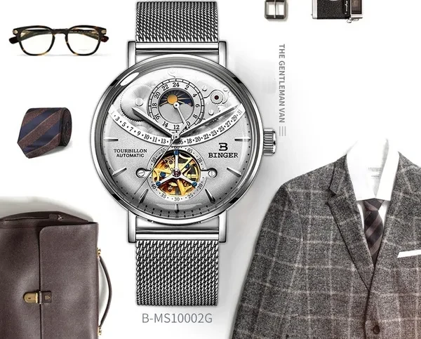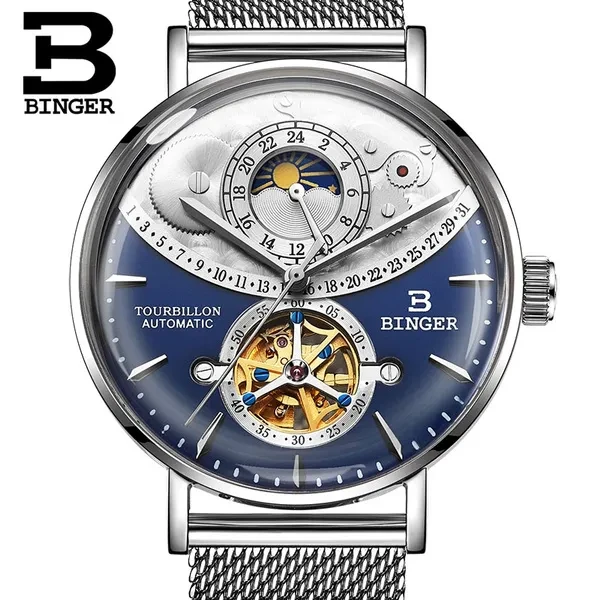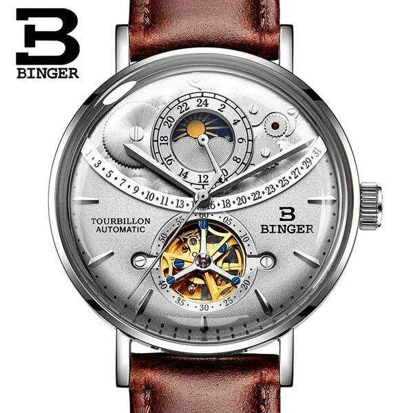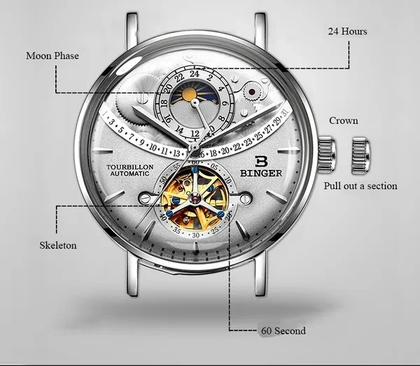 Note: There is no calendar function and the calendar window is decorated. Description Model Number: B-MS10002G-3 Item Type: Mechanical Wrist Feature: Water Resistant,24-hour indication, moon phase Water Resistance Depth: 3Bar Dial Diameter: 42mm Band Length: 21cm Case Thickness: 16mm Clasp Type: Hook Buckle Band Width: 20mm Case Material: Stainless Steel Band Material Type: Stainless Steel Dial Window Material Type: Curved mirror Movement: Automatic Self-Wind weight: 90G Feature: - Advanced manufacturing technology; - Cool & Specially designed big display screen; - Watch Crown With Environmental IPS Bronze Electroplating; - Stainless steel buckle & back case with 3D BINGER logo; - Display system of 12 hours or 24 hours; - 30 Meters Water Resistant(Please Don't Press Any Keys Underwater); Package included: -1 * Watch -1 * Gift Box -1 * Manual Instruction Please give us a five-star feedback if you are satisfied with our products and service. Reminder: 1. Please peel all films off before wearing. 2. Please keep the watch away from magnet to avoid making the watch stop working. 3. Turn normal position crown clockwise 30~40 rounds to wind up fully. 4. Stop turning the crown once you feel the spring tight.Otherwise it will lead to the crown off. Items will be shipped via the registered number of registered numbers, depending on the destination and other factors (custom clearance or vacation period, etc.). Delivery time is continuous. A) United States, Canada, Australia: 7-25 business days. B, UK, France, Germany, Sweden, Austria, Belgium, Denmark, Ireland, Luxembourg, Jack, Greece, Hungary, Iceland, Italy, Portugal, Romania, Slovakia, Spain, Switzerland: 8-25 business days. C) Other countries: 15-60 working days. Please note that the delivery time may be longer, especially at peak or bad weather conditions. If you pay now, we will ship within 48 hours! Wish you happy!