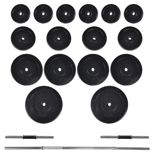 This set of ergonomically designed barbell/dumbbell set will allow you to perform a large range of exercises more easily and safely at home or in the gym. The set includes 1 barbell, 2 dumbbells, and 16 weight discs. The barbell/dumbbell set features solid chrome-plated bars with quick-action spring collars (barbell bar), non-slip grips, and fluted star-screw caps (dumb bell bar) for secure attachment of the weight discs. You can work out without worrying about safety issues. The weight discs are made with a robust PE casing. They can be combined in various ways for different training purposes. Delivery includes 1x barbell bar, 2x dumbbell bars, 6x 1.25 kg weight discs, 4x 2.5 kg weight discs, 4x 5 kg weight discs, 2x 10 kg weight discs, and 6x caps. Gripsize: approx. 14.5cm(barbell),10 cm(dumbbell) Weight Disc: Polyethylene casting Barbell bar: Ø2.5cm,length140cm, 2kg Dumbbell bar: Ø2.5cm,45cmlength, 0.5 kg 1.25kgweightdisc: Ø 17.5cm,3cmthick 2.5kgweightdisc: Ø 22 cm,4cmthick 5kgweightdisc: Ø 27cm,4.5cmthick 10kgweightdisc: Ø32cm,5.5cmthick Total weight including bars: 60.5 kg Total weight of discs: 57.5 kg