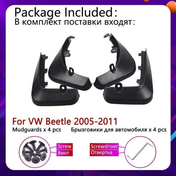 For VW Beetle 2005~2019 Deluxe Molded Splash Guards provide excellent lower body protection and accent the vehicle styling. Made of TPO Plastic to be rigid and paintable. They are molded to the contours of the vehicle for a custom fit These tough-wearing mud guards seamlessly blend with the vehicles styling and minimise the risk of dirt, road debris and stone chips flying up from the Front and rear tyres.Provide additional protection whilst enhancing the sporty exterior of your vehicle Installation instructions: 1,the car at the bottom of the original car screws with a wrench to screw down 2,take on the Mud flaps , good location, the screws installed 3,the screws installed in the corresponding hole on the Mud flaps. 4,the rest of the holes installed can be installed Package included: Mudguards*4 pcs Screw*8 pcs Screwdriver*1 pcs
