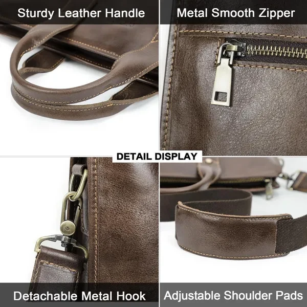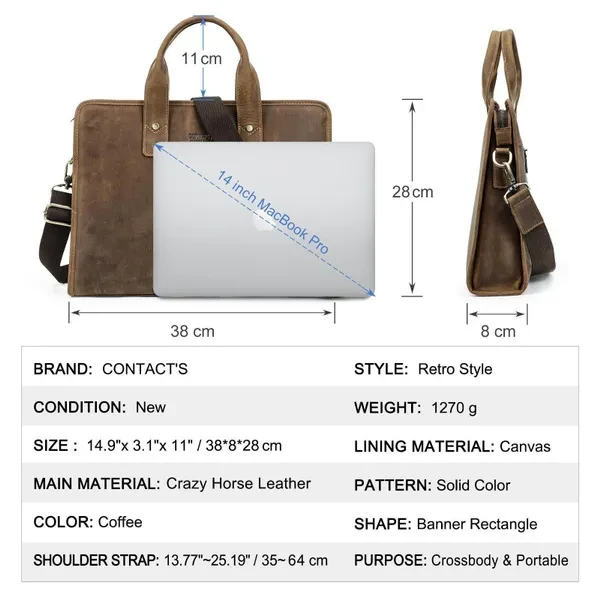 ● Brand Name: Contact'S ● Main Material: Genuine Leather ● Genuine Leather Type: Cow Leather ● Lining Material: Polyester ● Origin: Mainland China ● CN: Guangdong ● Place Of Origin: China (Mainland) ● Material Composition: vegetable tanned leather,crazy horse leather ● Closure Type: zipper ● Item Height: 28cm ● Item Width: 8cm ● Item Length: 38cm ● Item Weight: 1.13kg ● Gender: MEN ● Number of Handles/Straps: Single ● Style: vintage ● Pattern Type: Solid ● Model Number: MB242 ● Interior: Interior Slot Pocket,Cell Phone Pocket,Interior Zipper Pocket,Interior Compartment,Computer Interlayer ● Handle/Strap Type: Soft Handle ● Exterior: Open Pocket ● Size: 14 inches ● Color: Coffee Feature: 1.Durable genuine leather quality - The coffee bag made of crazy horse genuine leather ,the DARK coffee one made of quality vegetable tanned leather; and the lining is polyester. 2.Roomy capacity - Fits for 14 inches macbook pro. 3.Widely usage & Generous man design - A quality and popular design bag for men, it is ideal for daily,school, dating, shopping and travel using. A practical gift for boyfriend, husband, fathers and sons.EU Representative Info: