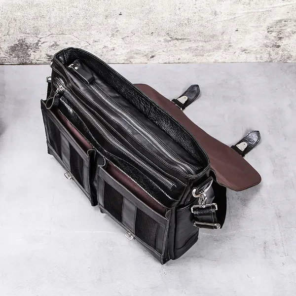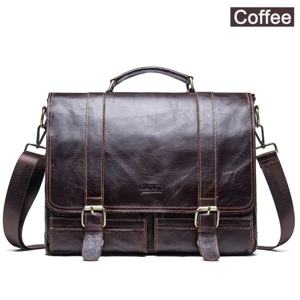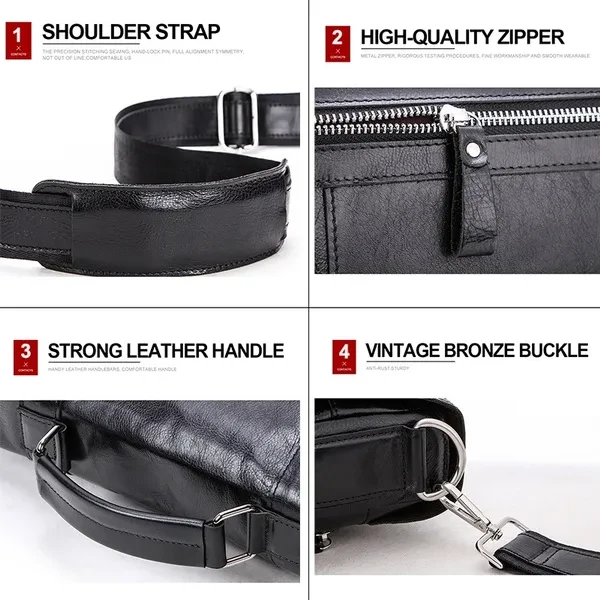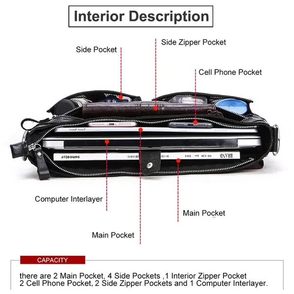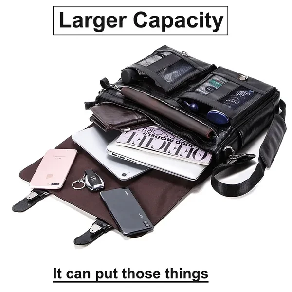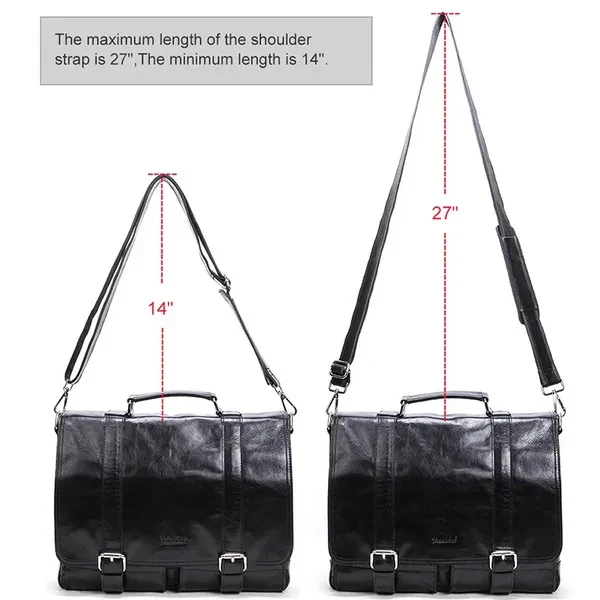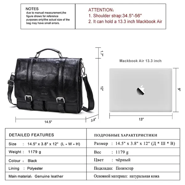 【Brand Name】CONTACTS 【Leather】Genuine Leather 【Dimensions】About 14.5'' x 12'' x 3.8''(L*W*H) (As the picture shown) 【Weight】About 1179 g 【Shoulder Strap】34.5''-56'' 【Color】Black,Coffee 【Item Type】Messenger Bag,Satchel,Briefcase 【Interior】1 zipper pocket(including 2 main pocket,1 computer interlayer,1 interior zipper pocket,2 cellphone pocket),1 zipper pocket,2 Hollow Pocket,2 Side water bottle holder