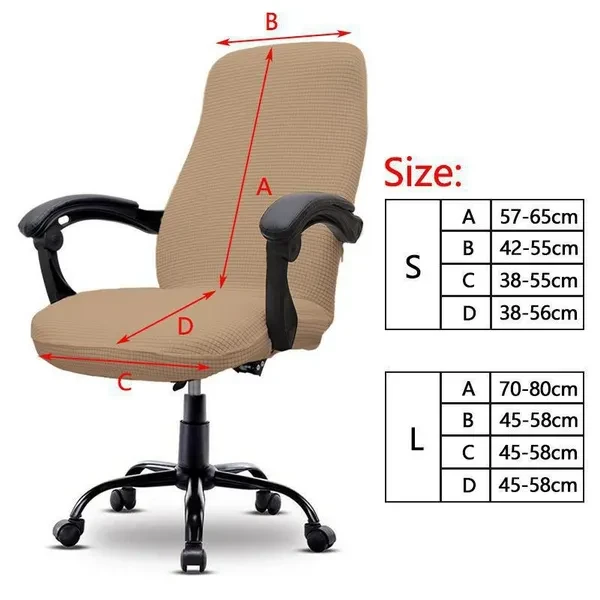Packing list: 1pc * Office Chair Cover (not included chair) ?Polyester fabric Color: Coffee, Navy, Black, Wine red Applicable chair Size: S size: Seat back width: 42-55 cm / 16.5-21.6 inches Chair back height: 45-56 cm / 17.7-22 inches Chair back thickness: 2-6 cm / 0.78-2.4 inches Chair length: 38-55 cm / 15-21.6 inches Seat width: 38-55 cm / 15-21.6 inches M size: Seat back width: 42-55 cm / 16.5-21.6 inches Chair back height: 57-65 cm / 22.4-25.6 inches Chair back thickness: 6-10 cm / 2.4-3.9 inches Chair length: 38-55 cm / 15-21.6 inches Chair width: 38-55 cm / 15-21.6 inches L size: Seat back width: 45-58 cm / 17.7-22.8 inches Chair back height: 70-80 cm / 27.6 - 31.5 inches Chair back thickness: 13-17 cm / 5-6.7 inches Chair length: 45-58 cm / 17.7-22.8 inches Seat width: 45-60 cm / 17.7-23.6 inches ?Polar Fleece fabric Color: White,Navy blue,Blue,Black,Taupe,Green,Wine red,Khaki,Beige,Light grey,Light coffee,Light purple,Dark grey,Dark coffee Description - High-density fabric protects your chair from unexpected stains - Active Dye technology used for strong color fastness. - Elastic fabric for easy application. - Elastic band and zipper design offer fit and non-slip grip. - Available in different colors and patterns design to match any interior. - Perfect choice for home study,office. - Totally machine washable. Installation Notes: 1. Set the hem of the seat cover from the back of the seat. 2. Pull the zips on both sides. After pulling the zipper, stretch the hem to the bottom of the seat. 4. After you have set it up, you can sort it out. Note: Please carefully compare the product size chart before buying, do not take a mistake. Please understand the color difference caused by shooting light, display, etc. Thanks to the manual measurement, please allow 2-3cm measurement error, thank you.