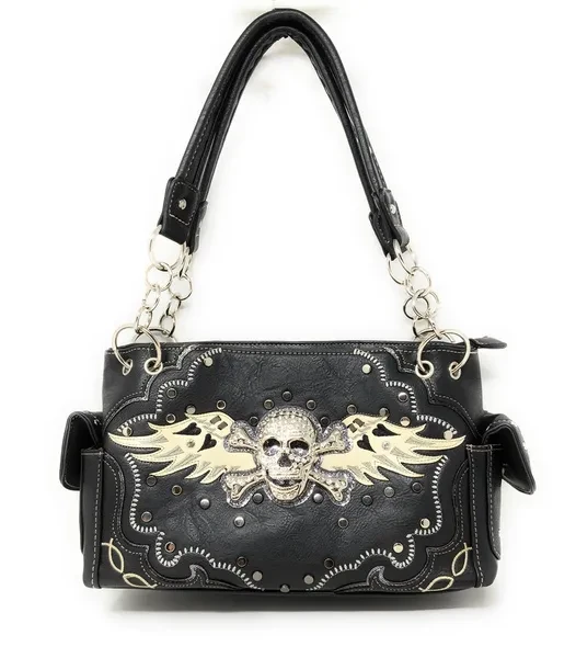 Texas West Women's Embroidered Metal Skull With Wing Purse Handbag and Wallet set Premium Concealed carry purse. Concealed carry pocket: 9" x 6", fits most guns and pistols. Size: Handbag 13" x 8" x 5". Wallet: 7.5" x 4.5" x 1". Handbag with 2 compartments inside. Zip closure on top and inside. 2 side pockets with button closure on the side. Extra pocket on the back is for everything easy to get, like keychains, phones. Same business day handling with fast shipping.