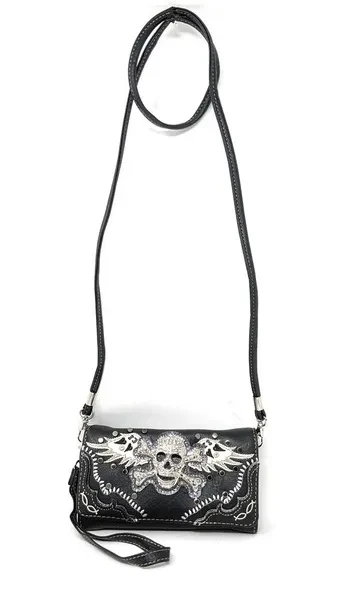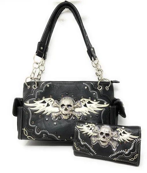 exas West Women's Embroidered Metal Skull With Wings Purse Handbag and Wallet set