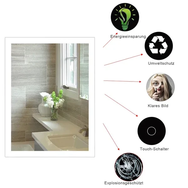 These upgraded wall mounted lighted vanity mirror has got an unique defogger button, which will be effective few seconds after turning on. The built in anti-fogging function means no need to constantly treat your mirrors with fog free spray, or rinse them multiple times per shower. Besides, you can also turn it off as it is not needed, as there are the mirror with demist function, but it was always heating as long as the power is on, which is not that convenient as sometimes you are not needed it. Specifications: 1. 4mm environmental protection copper-free mercury mirror 2. Aluminum alloy frame + matte, width 40MM, without acrylic, 3. Color temperature: 6400K +/- 300k 4. Single touch switch (located in the lower right corner, can be hung horizontally and vertically) + anti-fog function 5.2835 LED light strip 5. Size:50*70cm/60*80cm/70*90cm Package Included: 1 x LED Light Mirror 1 x Accessory
