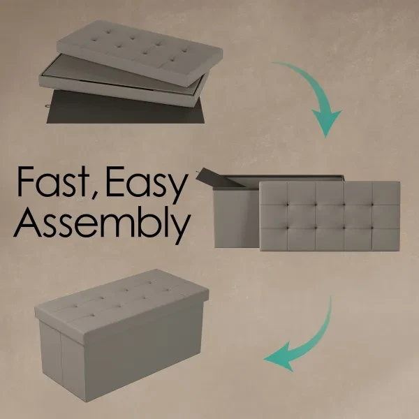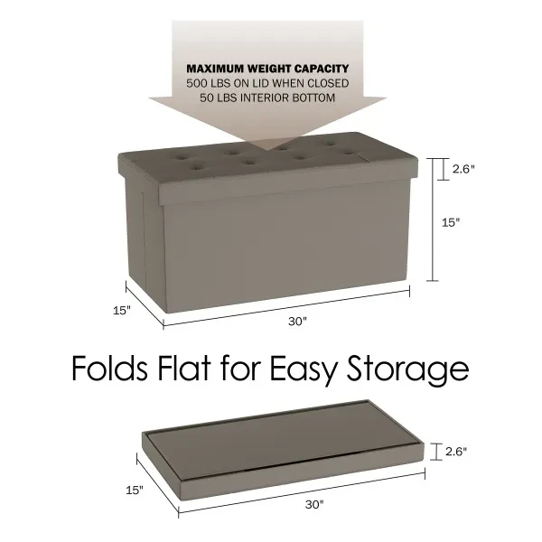 FOLDABLE STORAGE AND SEATING-The collapsible design of this storage trunk makes it easy to set up a cozy, padded seating within seconds! It can be folded flat when not in use for convenient storage, making it perfect for dorms, RVs and small apartments. VERSATILE USE- This multipurpose bench makes a great footrest, bed stool, toy chest and more. It is perfect for keeping bedrooms, living rooms and utility rooms organized. The inner bin is removable for more storage and organization options. STURDY COMFORT- Constructed from sturdy MDF, the body and lid of the ottoman can hold up to 500 pounds as a seat or 50 pounds for internal storage. The tufted, foam padded lid adds a comfortable seat in any room. STYLISH Decor- This bench features a premium, faux leather outer covering, making it super easy to clean with a damp cloth. The modern, clean lines with tufting and stylish stitching bring chic function to your home. PRODUCT DETAILS- Materials: Synthetic Leather, Foam, Polyester and MDF. Open Dimensions: (L) 30 inch; x (W) 15 inch; x (H) 15 inch;. Folded: (L) 30 inch; x (W) 15 inch; x (H) 2.6 inch;. Weight Capacity: 500lbs, Interior 50lbs. Color: Pewter Gray.