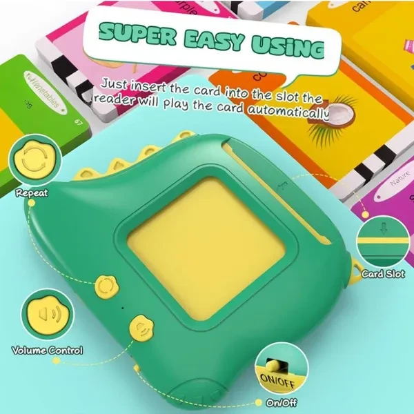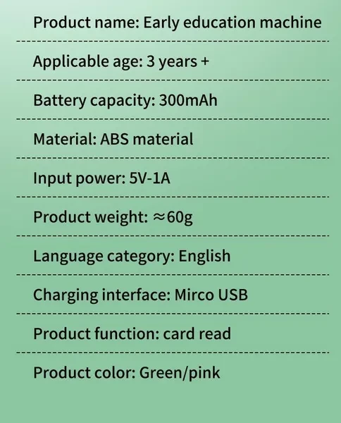 Main function: Enlightenment early education, suitable for children under 6 years old, equipped with 112 cards, a total of 224 English words Battery: Built-in 300mah Connection: No need to connect, insert card to play Charging: USB charging Product size: 11.5*95*21mm The packaging boxes of the English and Spanish versions are different, and the product appearance is the same. The Spanish version has both Spanish and English pronunciations. Note: 1.Keep away from fire and water. 2.Due to the difference between different monitors, the picture may not reflect the actual color of the item.We guarantee the style is the same as shown in the pictures.
