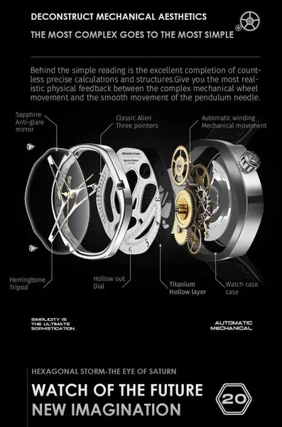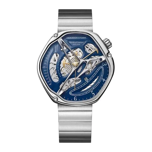 Hexagon Storm Mechanical Wristwatches Series name Hexagon Storm Movement type: automatic winding mechanical movement Power reserve up to 36 hours Pointer style: Special-shaped three-pin type Dial diameter 44 mm Dial thickness 13 mm Strap width 20 mm Watch circumference 240 mm Watch mirror Sapphire anti-glare mirror Case material: 316L stainless steel Dial Color Crescent White/Prussian Blue/Graphite Black Strap material One bead stainless steel strap/imported first layer cowhide Buckle type Classic double-button butterfly buckle Waterproof rating 5 ATM Warranty service One year warranty Hexagonal Custom Dial: Movement type: mechanical movement Pointer style:specual-shaped three-pin Watch band type: Domino steel band/ Leather band Crown type: screw-in type Clasp type:classic double-button butterfly buckle 48h Power Reserve -10/+15 seconds/day range 21600 times/hrotation frequency 316L Stainless Steel Dial color: white/black/blue Strap material: stainless steel/ leather Watch mirror: sapphire anti-glare mirror