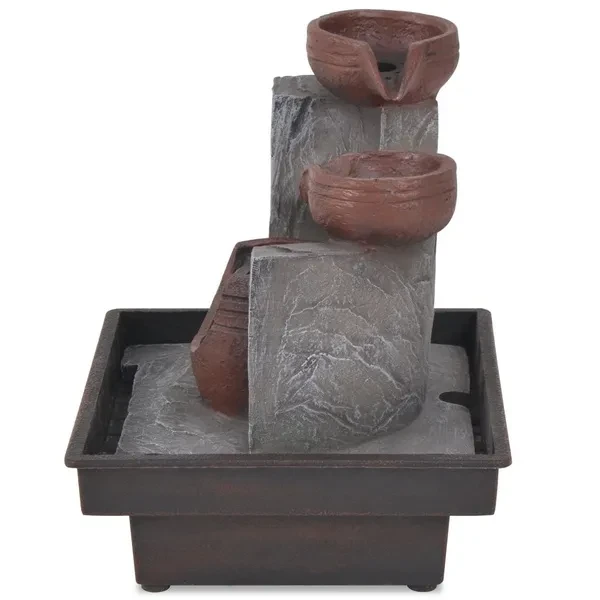 This LED-illuminated indoor fountain is a great choice to create a relaxing feel-good atmosphere in your home. The fountain is made of polyresin. The water flows down three levels and is illuminated by LEDs. This creates an impressive visual effect, especially in the dark. Let yourself be carried away by the flowing and rippling water sounds into a relaxing, meditative world away from everyday life. The supplied high-quality pump ensures smooth water circulation. This self-contained water feature can be set up anywhere in your house. Color: gray and brown Material: polyresin + plastic base Dimensions : 20 x 18 x 22 cm (L x W x H) Adapter input: 230-240 V ~, 50 Hz Adapter output: 12 V ~, 300 mA Power of the pump: 12 V ~, 50 Hz, 2 W Power of the LED lights: 3-3.4 V?, 0.06 W, 20 mA Easy handling Delivery includes: 1 x adapter 1 x LED light 1 x pump 1 x indoor fountain