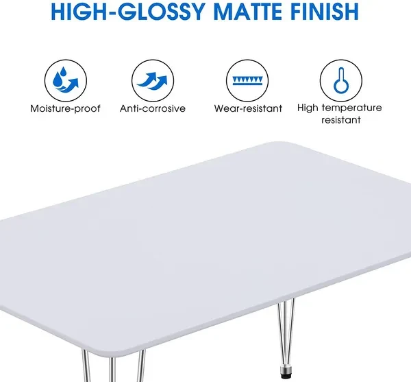 - [Matte White Rectangular Dining Table]: With its high-glossy matte finish and modern design matching with any décor style, this table is perfect for any home. Natural healthy paint with 5 times automatic-painting process, delicate and smooth, which is moisture-proof, anti-corrosive, wear-resistant, and high temperature resistant. Easy to clean with a damp cloth.