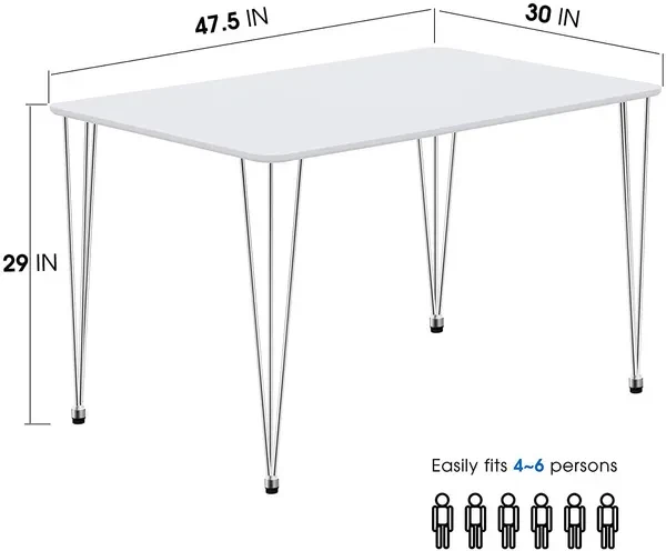 - [Large size white dining table]: The Dimension for the dining table top is 48inch x 30inch(LxW)and table height is 30inch. The table easily fits 4~6 persons. Ideal for restaurants, living room, dining room, and kitchen, etc. Used as the table for children's arts/craft, coffee table, or conference table.