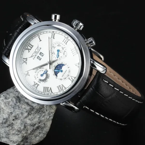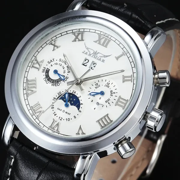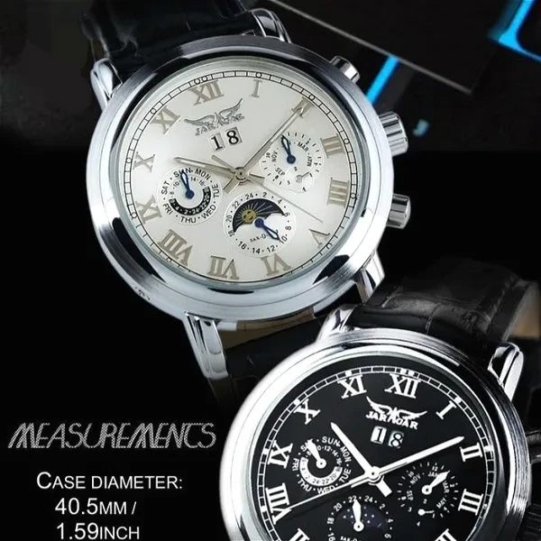Item Type: Mechanical Wristwatches Feature: Complete Calendar,Luminous Hands,Moon Phase Band Material Type: Leather Water Resistance Depth: No waterproof Dial Window Material Type: Glass Movement: Automatic Self-Wind Clasp Type: Buckle Brand Name: JARAGAR Case Material: Stainless Steel Packing Including: -1*Mechanical Watch -1*Gift Box -1*Instruction Thanks for visiting our sotre~