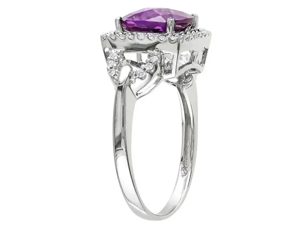 Lab-Created Alexandrite 3.0 Carat (ctw) and Diamond Halo Ring 10K White Gold This majestic Alexandrite ring shows off the gem's brilliant purple coloring through the luxurious cushion cut. A halo of sparkling white diamonds brings the total carat weight to 3.0 carats (ctw). Crafted expertly in polished 10 karat white gold, this ring features an impressive and regal setting. Beautifully crafted in 10k white gold with a Polished Finish Stone Type: Alexandrite; Color: Violet; 2.80 CTW; Quantity: 1; checkerboard-cut Cut; Cushion Shape; Lab Created; Prong Setting Stone Type: Diamond; Color: G-H; Clarity: I1-I2; 0.20 CTW; Quantity: 40; Checkerboard Cut; Round Shape; Dimensions: 8 x 8 mm; Natural; 4-Prong Setting Alexandrite Gemstone is the Alternate Birthstone for the Month of June This Diamond Ring is the perfect gift for any birthday, anniversary, holidays, thank you, thinking of you, or for any reason at all SKU: 08DLG1094CAX-P