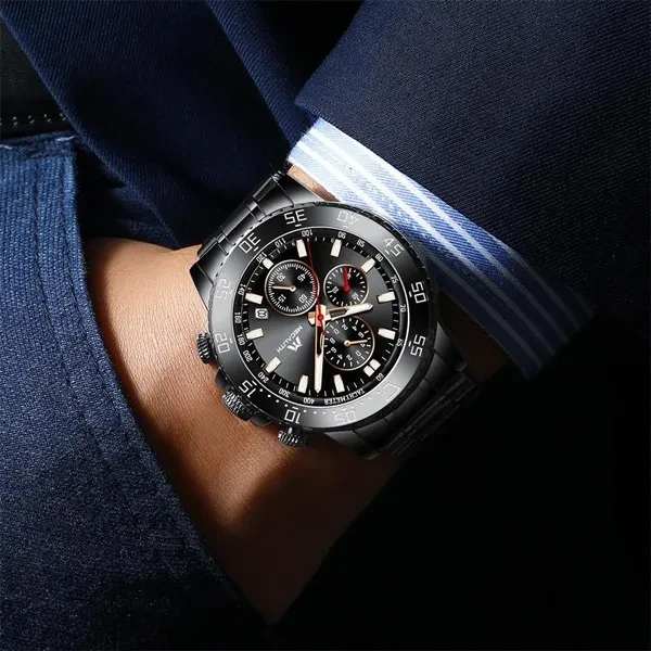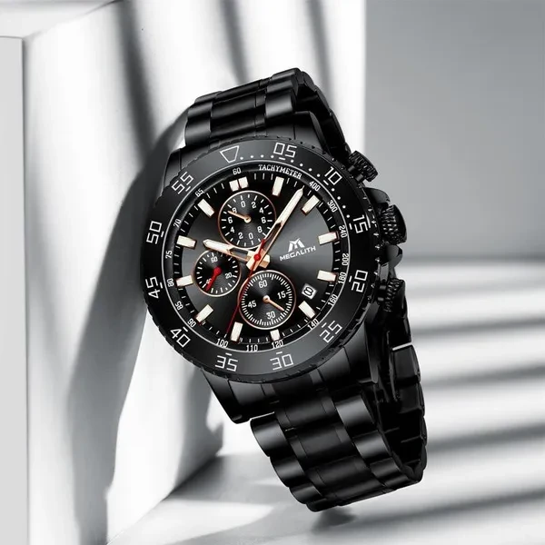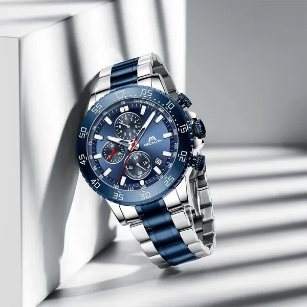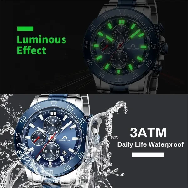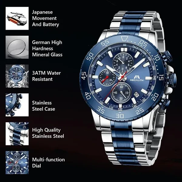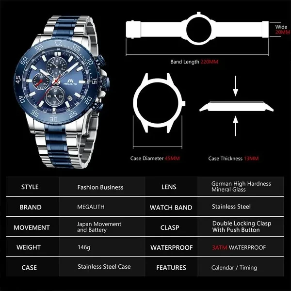 ★MEGALITH BRAND★ ★Specification★ Dial Case Diameter: 45 mm / 1.77 inch Dial Case Thickness: 13 mm / 0.51 inch Band Width: 20 mm / 0.78 inch Band Length: 220 mm / 8.66 inch Watch Weight: 146 g / 5.14 oz - Multifunctional: Chronograph, Luminous Pointer, Date Display - 3ATM Water Resistant: Not suitable for swimming, bathing, diving. *Nice Gifts* : The watches are great gifts, birthdays, friends, loved ones, father's day, graduation gifts, valentines day gifts, or as gifts for business and parties. ★Package Included★ 1 * MEGALITH Watch 1 * Watch Instruction Manual 1 * Watch Link Remover 1 * Exquisite Gift Packaging 1 * Microfiber Cleaning Cloth ★NOTE: 1. Clean the strap and watch face by the microfiber cleaning cloth provided on regular basis is highly recommended. 2. Too much water contact will shorten watch life. 3. Please never to press any button in water and avoid hot water. ★Tips: 1.If you need to buy more than 2 watches, you can place multiple orders! 2.In order to better complete the transaction, please sure your receiving address and order information are correct. If you have any questions, please feel free to contact Customer Services Support Team! You will find more Amazing WATCHES if you visit our Store! Happy Shopping!