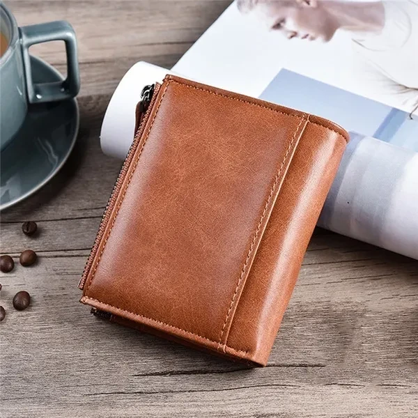 Main material: PU Leather Pattern Type: Solid for: men size:12*10*2.5cm/4.72*3.94*0.98inch color:brown,black Structure: 3 fold, there is 1 bill slot, 7 card slots, 1 photo bit, 6 inner pockets, 3 zippers slots. Features: The style is high-grade and simple, soft and comfortable leather. Package:1pcs*men zipper wallet