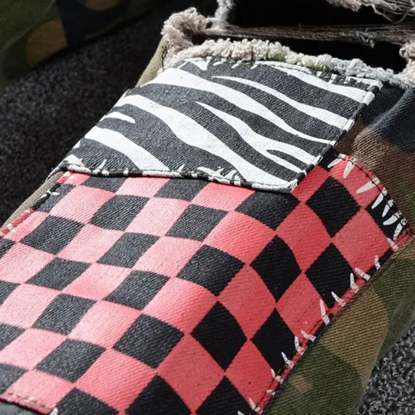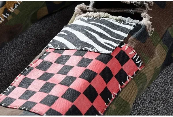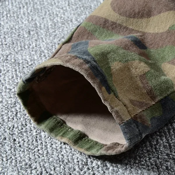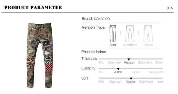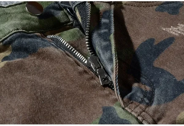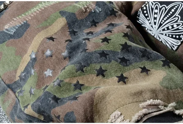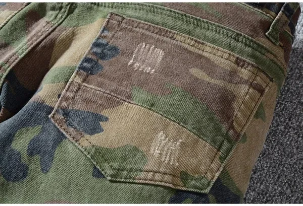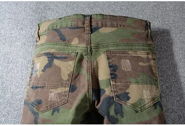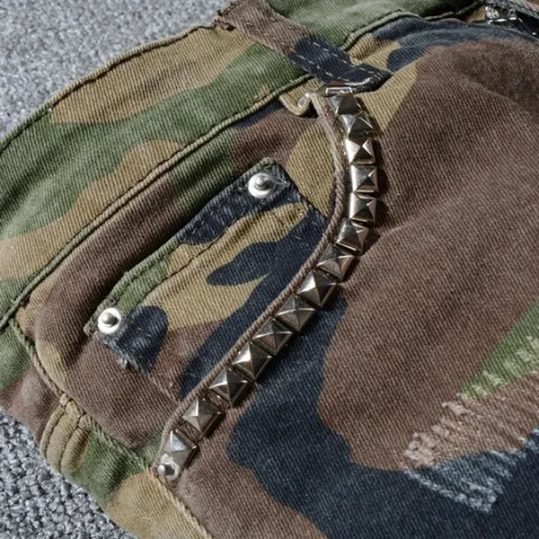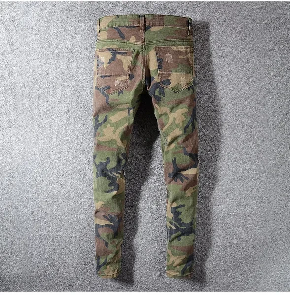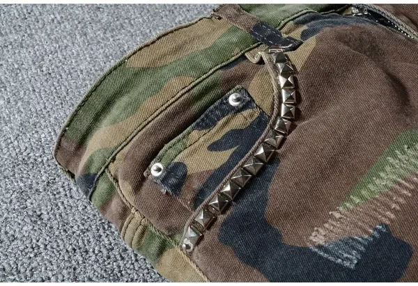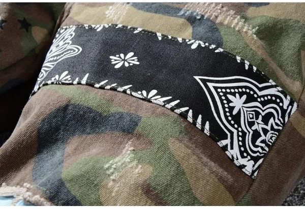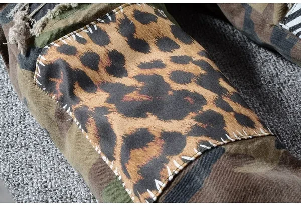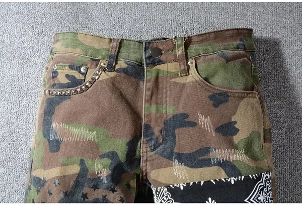 Men's Camouflage Leopard Patchwork Stars Printed Jeans Slim Rivet Holes Ripped Stretch Denim Pants Plaid Trousers