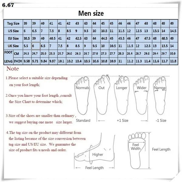 Shoe type: men's shoes Heel Type: Flat Heel height: 1-3cm Sex: Male Occasion: Business, Leisure, Vacation Season: Winter, Autumn, Spring Color: black, yellow brown, dark brown, gray Material: Upper material: PU leather Outsole material: rubber Package Included: 1* Pair of shoes (without box) warn: 1. Please choose the appropriate size according to your foot length; 2. After knowing your foot length, please refer to the size chart to determine the size you should buy; 3. Due to size conversion between label size and US/EU size, the label size on the product may differ from the list. We guarantee that the product size will match your needs and order.