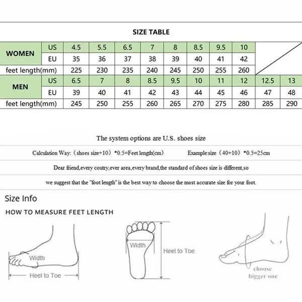 Size: Please note. Simple packaging, in order to better protect the shoe CN/EU Size 35= Foot Length 225mm CN/EU Size 36= Foot Length 230mm CN/EU Size 37= Foot Length 235mm CN/EU Size 38= Foot Length 240mm CN/EU Size 39= Foot Length 245mm CN/EU Size 40= Foot Length 250mm CN/EU Size 41= Foot Length 255mm CN/EU Size 42= Foot Length 260mm CN/EU Size 43= Foot Length 265mm CN/EU Size 44= Foot Length 270mm CN/EU Size 45= Foot Length 275mm CN/EU Size 46= Foot Length 280mm CN/EU Size 47= Foot Length 285mm CN/EU Size 48= Foot Length 290mm Why buy from us?  Worldwide fast shipping! Free tracking number! Quickly and satisfying communication! Unique high-quality goods! Best prices! Please reference our size picture carefully! Measured by hands, please allow 1-3mm error! Due to computer monitor, may exist some color error, please do not mind!
