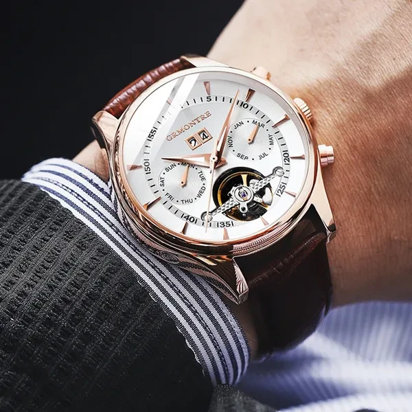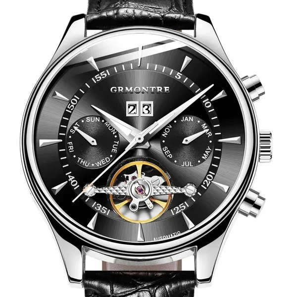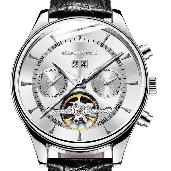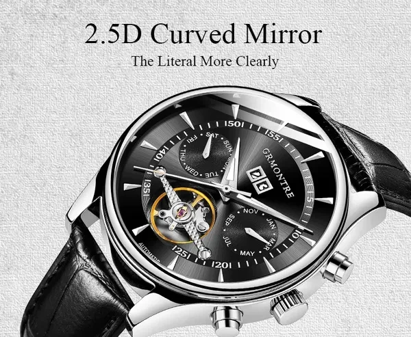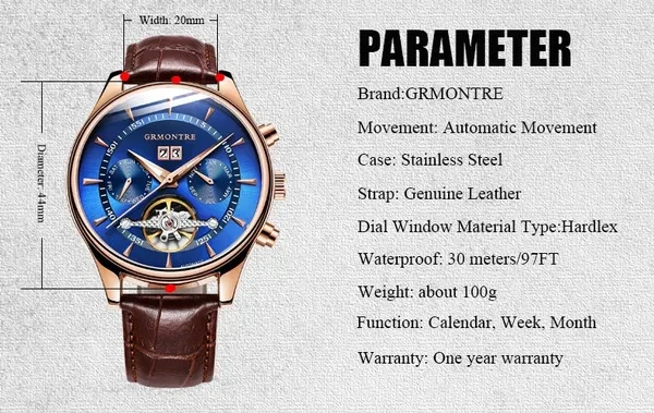 Description Item Type: Mechanical Wrist Feature: Month, Week , Date ,Water Resistant Water Resistance Depth: 3Bar Dial Diameter: 44mm Band Length: 20cm Case Thickness: 15mm Clasp Type: Buckle Band Width: 20mm Case Material: Stainless Steel Band Material Type: Leather Dial Window Material Type: Hardlex Crystal Movement: Automatic Self-Wind weight: 100g Please give us a five-star feedback if you are satisfied with our products and service. Reminder: 1. Please peel all films off before wearing. 2. Please keep the watch away from magnet to avoid making the watch stop working. 3. Please press the inside pusher beside of the case at the 2 o'clock with a needle to adjust the date. 4. Please press the inside pusher beside of the case at the 4 o'clock with a needle to set the month . 4. Please press the inside pusher beside of the case at the 7 o'clock with a needle to set the week. 5. Turn normal position crown clockwise 20~30 rounds to wind up fully. 6. Stop turning the crown once you feel the spring tight.Otherwise it will lead to the crown off. Pacel include: Watch + box Package: be cover with bubble wrap and packed with GRMONTRE gift box. with a English instruction book together .The outside box be cover with bubble wrap also.We promise the watch can't be hurt on the transportation Items will be shipped via the registered number of registered numbers, depending on the destination and other factors (custom clearance or vacation period, etc.). Delivery time is continuous. A) United States, Canada, Australia: 7-25 business days. B, UK, France, Germany, Sweden, Austria, Belgium, Denmark, Ireland, Luxembourg, Jack, Greece, Hungary, Iceland, Italy, Portugal, Romania, Slovakia, Spain, Switzerland: 8-25 business days. C) Other countries: 15-60 working days. Please note that the delivery time may be longer, especially at peak or bad weather conditions. If you pay now, we will ship within 48 hours! Wish you happy!