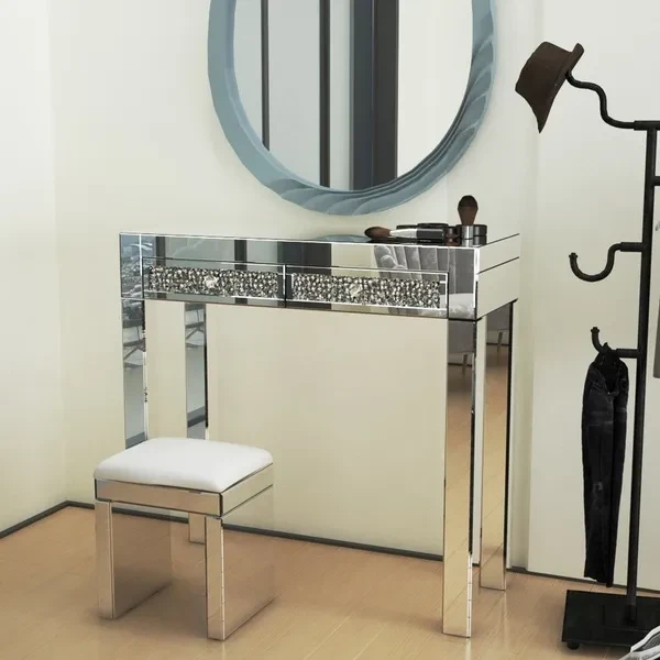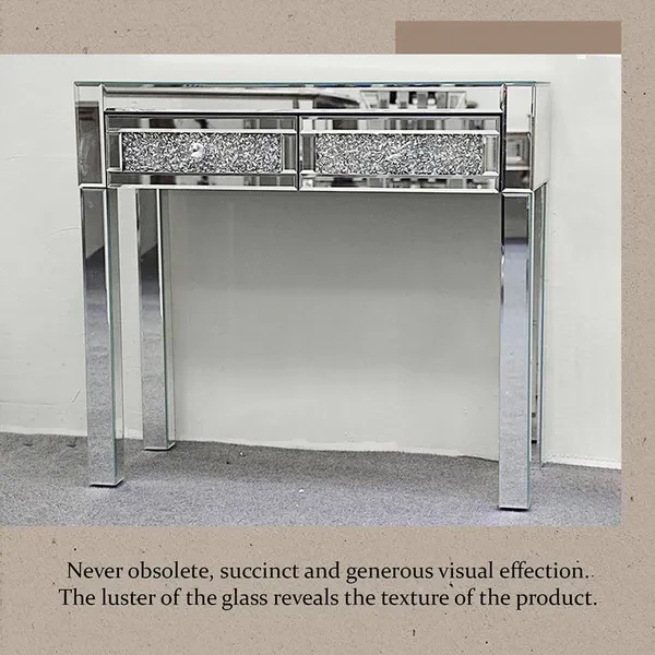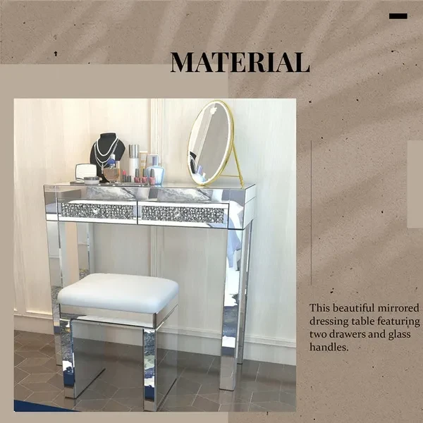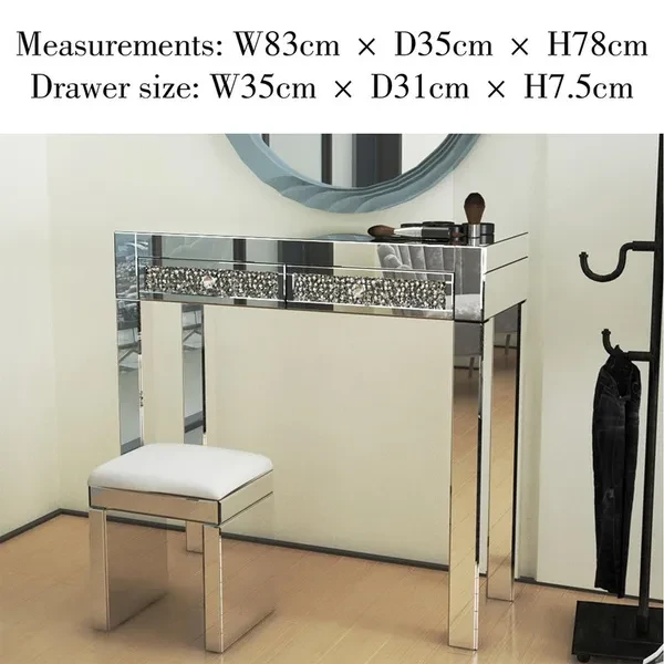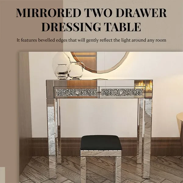 Description: The Madison mirrored dressing Table console is the latest addition to our mirrored furniture range It features bevelled edges that will gently reflect the light around any room It will add glamour and luxury to any room at an affordable price As part of our Milan mirrored furniture range, this beautiful mirrored dressing table featuring two drawers and glass handles will add some film star glamour to a bedroom or dressing room. Stool sold separately.  Specifications: Material: Mirror, MDF and glass handles Measurements: W83cm x D35cm x H78cm Drawer size: W35cm x D31cm x H7.5cm This item comes part assembled Package included:1x Table