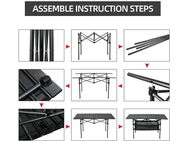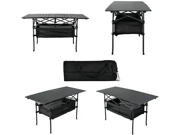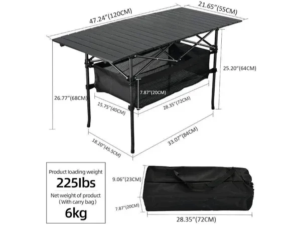 Convenient Basket Storage: An unique capacious storage mesh basket can be assembled underneath this table-top, to put small garden tools, toys, bags, mobile-phones, laptops inside. Easy to Assemble and Detachable: Compared with other folding table which can only fold the legs, our table can be overall foldable including the table plate. And it only takes few minutes to assemble. Premium Durable High Quality Material: This camping table is made of upgrade aluminum and surface is water-proof, stain-resistant, lightweight, and legs frame are made from strength steel, make it sturdy and durable. Multi-Function Folding Table For Daily Use: This portable folding table can be used as an outdoor dining table, BBQ Table laptop table, gaming table. Perfect for camping, beach, backyard, BBQ, party, patio, picnic. Portable And Easy To Carry With: Overall Dimensions: L 47in* W 21.65in * H 26.7in. Item Net Weight: 13.2lbs. Easy to be folded and set up, this table can be storage into a matched handbag.