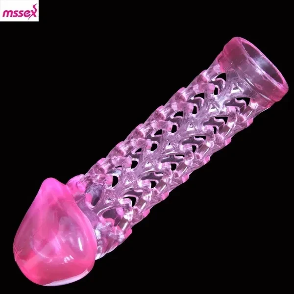 Net hole shape male extension sleeve reusable condoms for men, realistic extender sleeve Color : ship random, don't support color choice With good elasticity, fits for all.