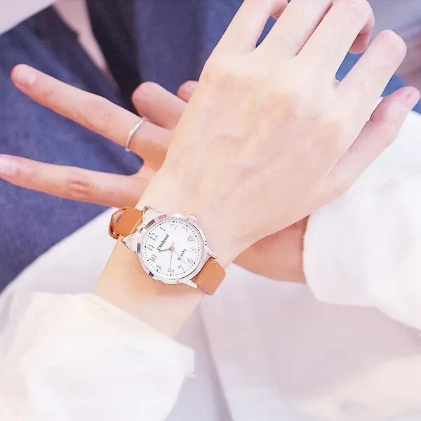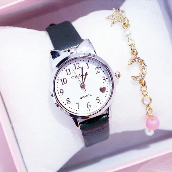 Feature: 100% New and high quality Gender :Student child girl Fashion Lovely And High Quality Trendy Watch! Movement: quartz watch Surface diameter: 2.7CM Dial thickness: 0.8CM Strap width: 1.4CM Strap length: 23CM Band material:Leather Case material: Alloy Perfect gift for Student child girl. suitable for any occasion(party, business, casual , daily life). Package contains : 1 x watch (excluding retail packaging box and bracelet)