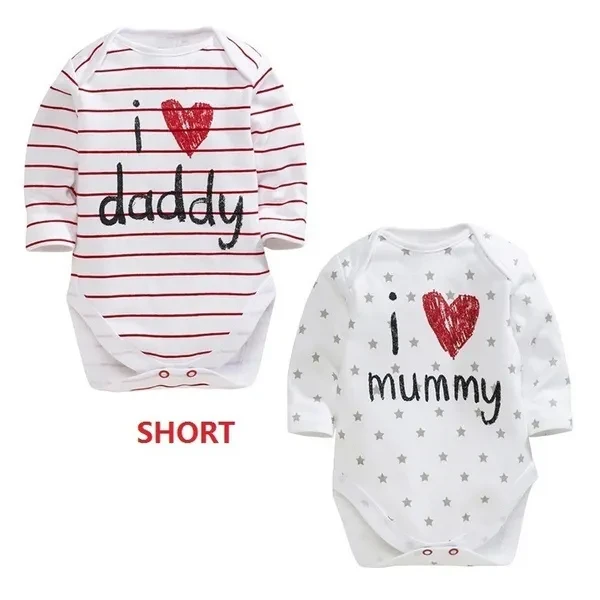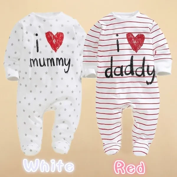White= Mummy Red= Daddy Material composition: Cotton Color: white, red Style:Long, Short Size:0-3m, 3-6m, 6-9m, 9-12m Reference Height: 3month, 6month, 9month, 12month Note: *Please allow 1-2cm error due to manual measurement. *The colors may have difference as the different display,please understand.