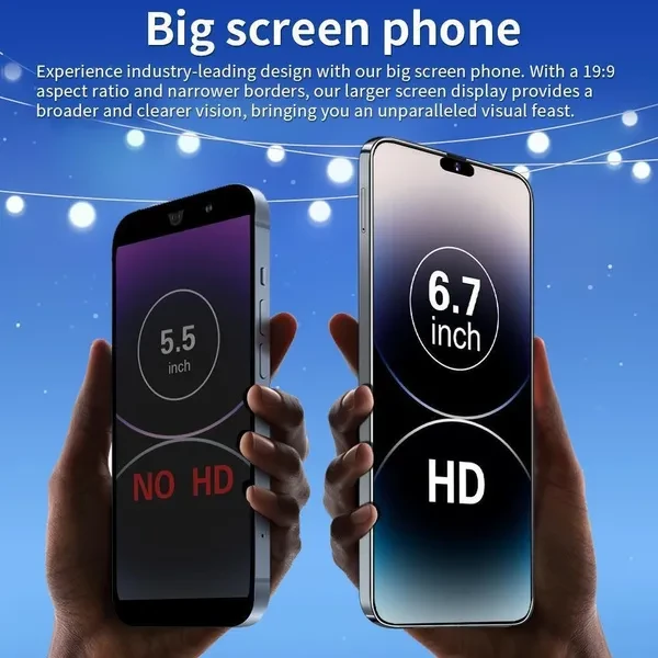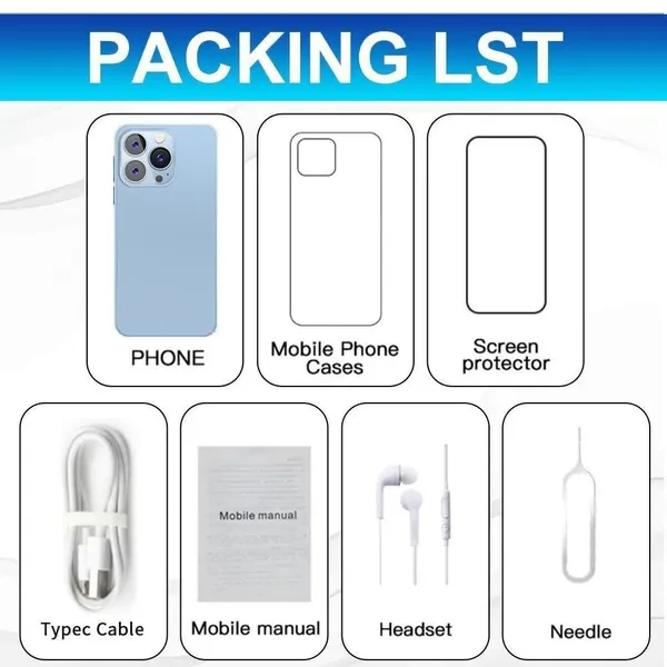 features -6.7 inch full screen i15 pro max provides the viewing experience you have always wanted. 7.3 screen to body ratio 93% -48MP front camera clear and fashionable self-portrait The world's leading 48MP front-facing camera of i15 pro max turns every selfie into a work of art. Whenever you are in the darkest light, you can experience higher brightness, color vitality, clarity and dynamic range. i15 pro max is right beside you, capturing every moment with crystal precision, turning your photos into masterpieces and shining in every photo -64MP rear HD camera The camera combination of i15 pro max is 48 million+64 million pixels. The main camera uses f/2.0 aperture and f/1.8 aperture to focus automatically. This powerful combination enhances the sensitivity under backlight or weak light. Just aim and shoot, i15 pro max will ensure that your photos remain clear and bright -Facial channel i15 pro max also supports face recognition. After activation, i15 pro max will scan your facial features and unlock them immediately. Using mobile phones has never been so simple and interesting -Powerful performance Qualcomm 888 10-core mobile platform uses 10mm technology to make young people fall in love with young people and other popular games -Android 13 New interactive design, simple and clear operation, simple and clear use of mobile phone, everything is very convenient -Dual SIM cards support TF cards Double card and double standby. The card slot does not distinguish between primary and secondary cards. It supports the networks of 50 major communication operators in the world Specifications 1. Model i15 pro max 2. Platform Qualcomm 888 10core 3. Standby dual sim dual standby (dual sim+dedicated micro SD card slot) 4. Screen 6.7 HD full-screen 2280 * 3200 5. Speaker 1511 box speaker 6. Frequency GSM5018001900MHz, 3WCDMA85019002100MHz, 4G LTE 5G 7. Vibration support 8. Color: black, white, gold, purple 9. Memory 16GB RAM+1TB ROM 10. Multimedia MP3MP43GPFM wireless Bluetooth 11. Camera 48MP+64MP 12. Multi-functional full-screen, face recognition, dual SIM card, Wifi, GPS, gravity sensor, alarm clock, calendar, calculator, recorder, video recorder, WAPMMSGPR, image viewer, e-book, world clock, task card, flash back IML back cover 13. Multi-language support 14. Other Android 13 systems 15. Battery 6800Mah lithium-ion battery look out Due to the difference in light, the actual color of the phone may be slightly different from the screen and pictures. The color name is only used to distinguish a single SKU. Please understand this. Thank you. Battery capacity is typical data of factory laboratory. The specific charging speed, usage time and other data will vary slightly according to the power cord, power adapter and ambient temperature. When the phone is completely powered off and automatically powered off, you need to charge the phone for more than 10 minutes to turn it on. It is recommended to charge when the battery power is lower than 20%. Available memory capacity depends on pre-installed software Product pictures and models, data, functions, performance and specifications are for reference only. We can improve the above content. For more information, see the product and product description. Unless otherwise stated, the data contained in this website are our internal test results and are compared with our products. Mobile phone does not support telecom CDMA Package included 1 x smartphone, 1 charger adapter, 1 headset, 1 x User Manual 1 phone case 1 x protective film