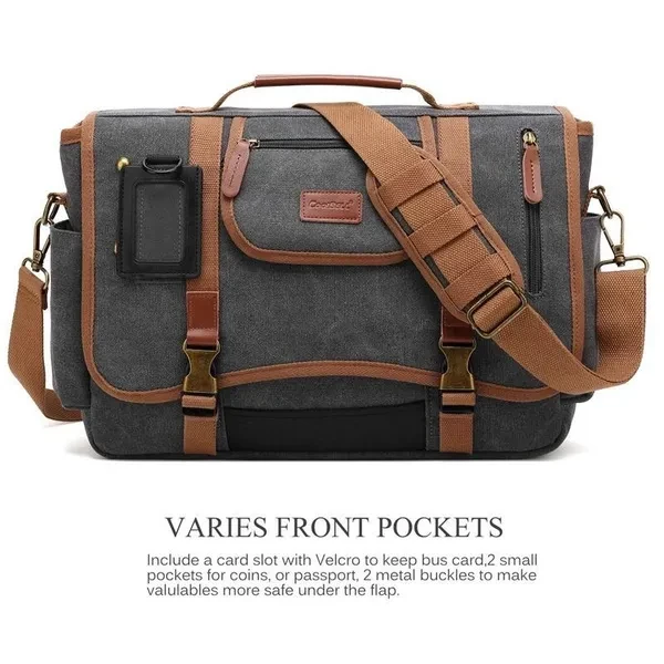 Brand: CoolBELL Description: Multi-functional Messenger Bag Size: 17.7 x 11.8 x 3.5 inches; Fits up to 15.6 inches laptop. Weight: 1.0 kg Color: Black Grey Material: Canvas; 210D waterproof polyester lining Large capacity for you: Fits up to 15.6 inches laptop like macbook,dell,asus, lenovo etc.Reasonable capacity is perfect for daily use like school life, work. business, and travel etc. Include a 15.6 inches laptop compartment, designed with elastic to fix the laptop, more protection for your electronics. Still more room for keeping books, documents,phones etc, ideal design for school / student. A wide flap to provides double protection for your valuables. Roomy Main compartment. The main compartment keeps 15.6 inch laptop, iPad, books, two-days clothes.Laptop compartment designed with Veclo strap to fix laptop, more safe and more protection. Varies pockets. Under the flap,5 small pockets, 1 big pockets,7 pen slots; 3 small pockets with zipper on the flap; Include a removable pouch with Velcro for keeping bus card. Two side pockets for keep water bottles. Design for business men, students, teachers etc. You could use this functional messenger bag for school life, business activity, daily time, shopping, travel etc. Functional bag design for you. Lightweight design is easy for carrying. Two carrying style: Shoulder bag and messenger bag, handbag. More details Metal Buckle design with 2 metal buckles, improve quality and level in appearance. Real leather Decorade with real leather, this bag can be more good-looking and durable. Card slot A remove card slot to paste on the bag with Velcro, you could use it to hold bus card, quickly use it when paying. Real leather handle To improve the holding feeling, we use real leather to produce the handle, make it comfortable and durable for you. Package Include: 1 x Messenger Bag