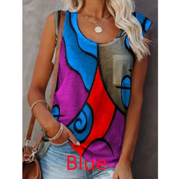 NEW Women's Fashion Sleeveless Stitching T-shirt Round Neck Printing Blouse Ladies Female Plus Size Tops