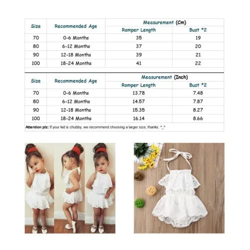 WELCOME - Quality is the first with best service. customers all are our friends. - Fashion design,100% Brand New,high quality! - Material: 100% Cotton - Color: As shown in the pictures - Listing Includes: One-Piece Romper - Sizes: 70/80/90/100 There is 2-3% difference according to manual measurement. please check the measurement chart carefully before you buy the item. 1 inch = 2.54 cm Please note that slight color difference should be acceptable due to the light and screen.What You Got: 1 x Girl Dress Romper