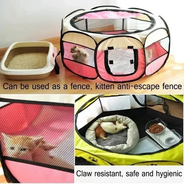 Size: S:74CM*74CM*43CM----29.13*29.13*16.9inch L:91CM*91CM*58CM----35.82*35.82*22.83inch Colors:gray,pink,coffee,yellow Features : 1. Folding design, easy to storage, portable 2. Washable and easy to clean 3. Extremely durable and water/stain resistant 4. 8-Panel Mesh Windows and An Easy-To-Access From Each Mesh Window. 5. 2 Zippered Doors, 1 Top and 1 Side 6. Provides enough space for your pet to play and exercise 7. Ideal for Indoor and Outdoor Uses Material:600D Oxford cloth/PVC Plastic mesh